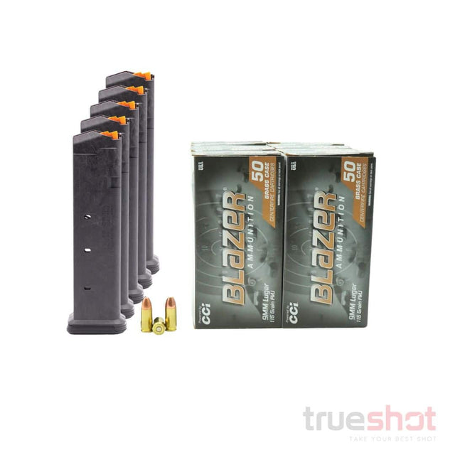 BUNDLE DEAL: 5 Black 21 Round Magpul GL9 Glock Magazine and 500 Rounds of Ammo - Retail / CCI 9mm 115 Grain is backordered and will ship as soon as it is back in stock.